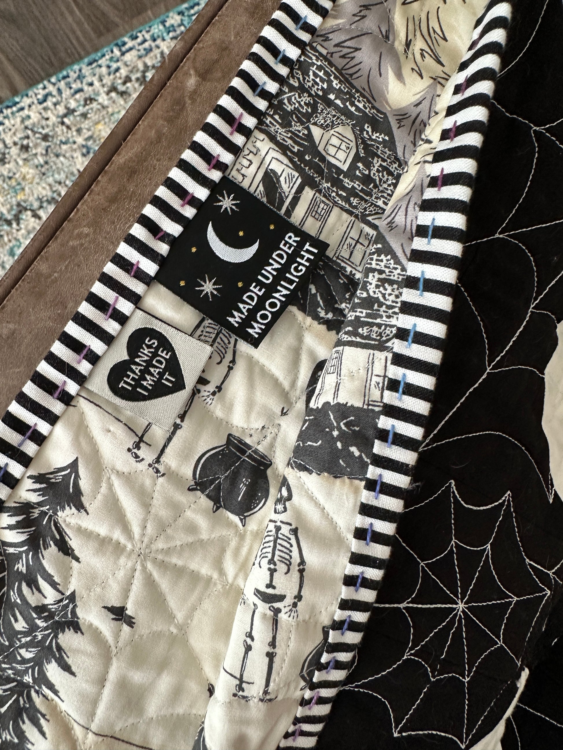 Introducing the "Ghostly Whimsy" Quilt! This unique piece features the Ghost Pattern, with playful white ghosts set against a striking black background. Each ghost boasts rainbow-colored eyes and mouths, adding a vibrant pop of color to the design. But that's not all – the thread used for quilting is glow-in-the-dark, lending an extra touch of spookiness when the lights go out. The quilting itself features a mesmerizing spider web pattern, enhancing the Halloween theme. To complete the look, the binding is meticulously hand-stitched with a purple ombre thread, adding a final flourish of love and craftsmanship to this bewitching quilt. Perfect for adding a touch of whimsical charm to your home decor or as a standout gift for any Halloween enthusiast.