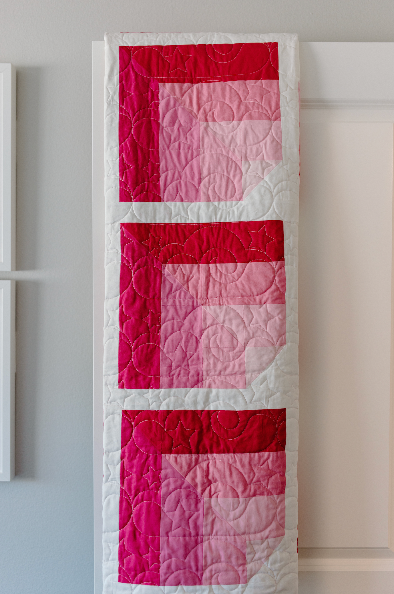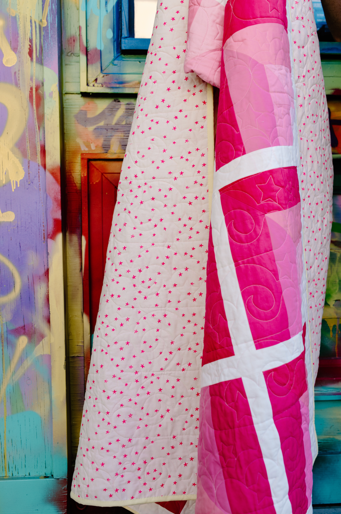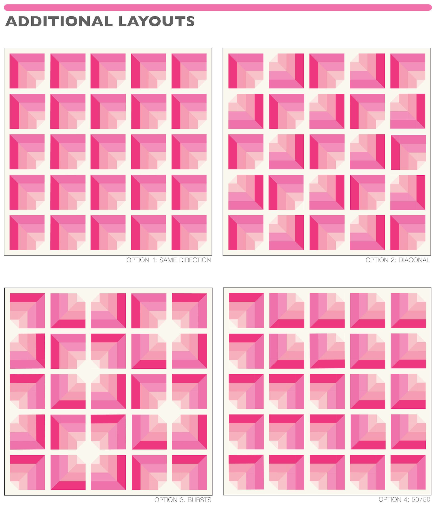 Cover fabrics: All fabrics used are Robert Kaufman Kona cotton solids and are as follows: Snow, Pink, Medium Pink, Carnation, Bubble Gum, Candy Pink, Bright Pink, and Honeysuckle. This kit is currently for sale at Pear Tree Market.