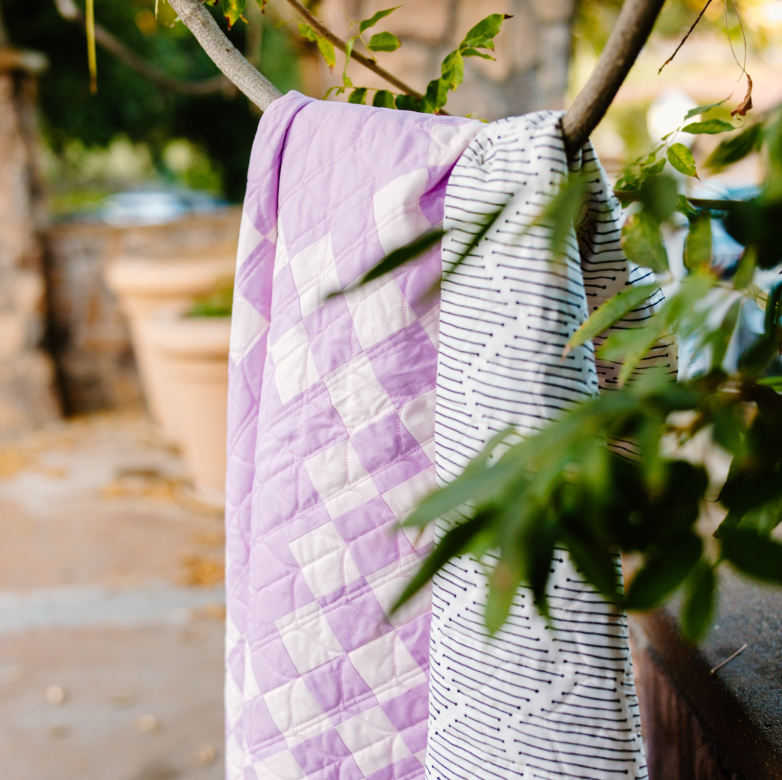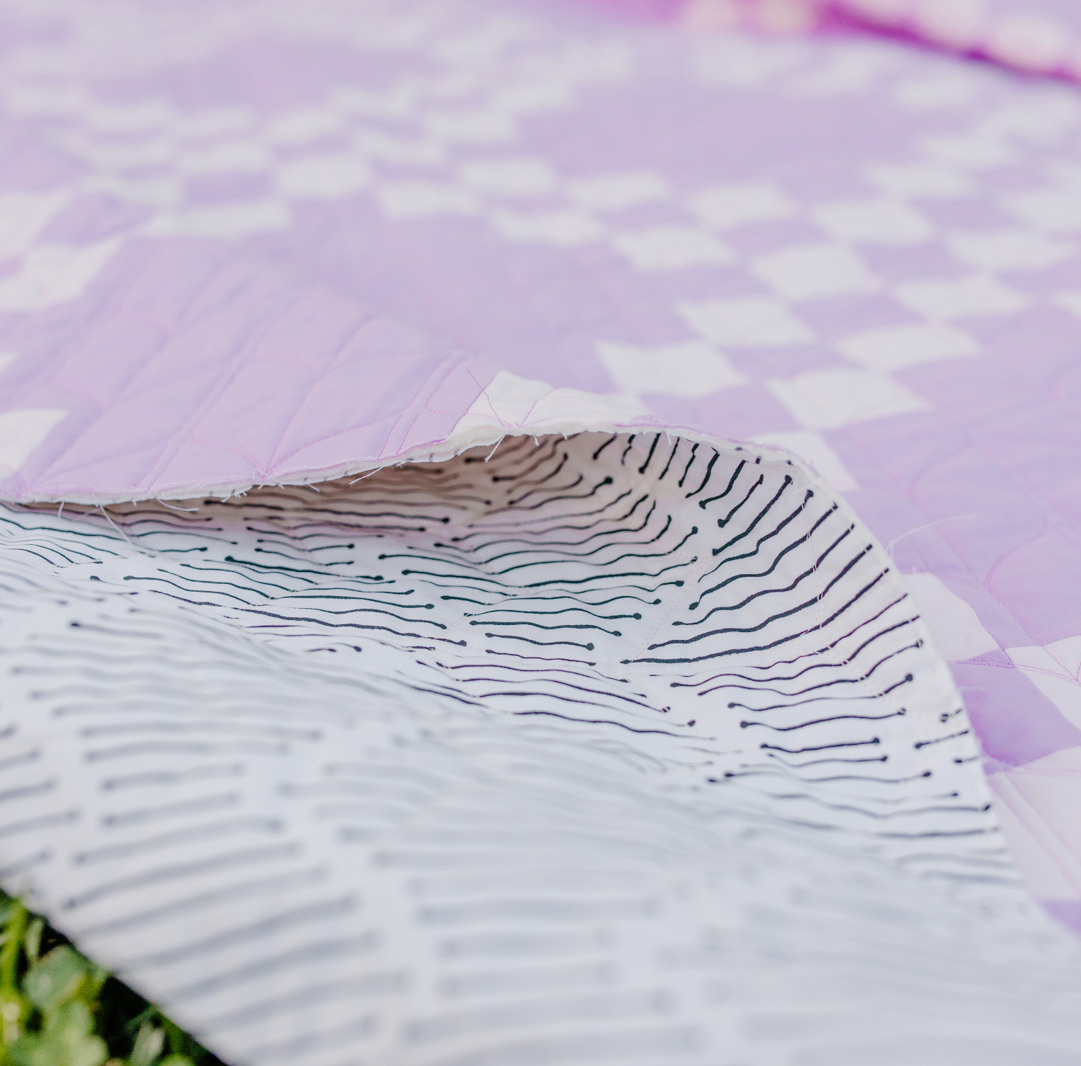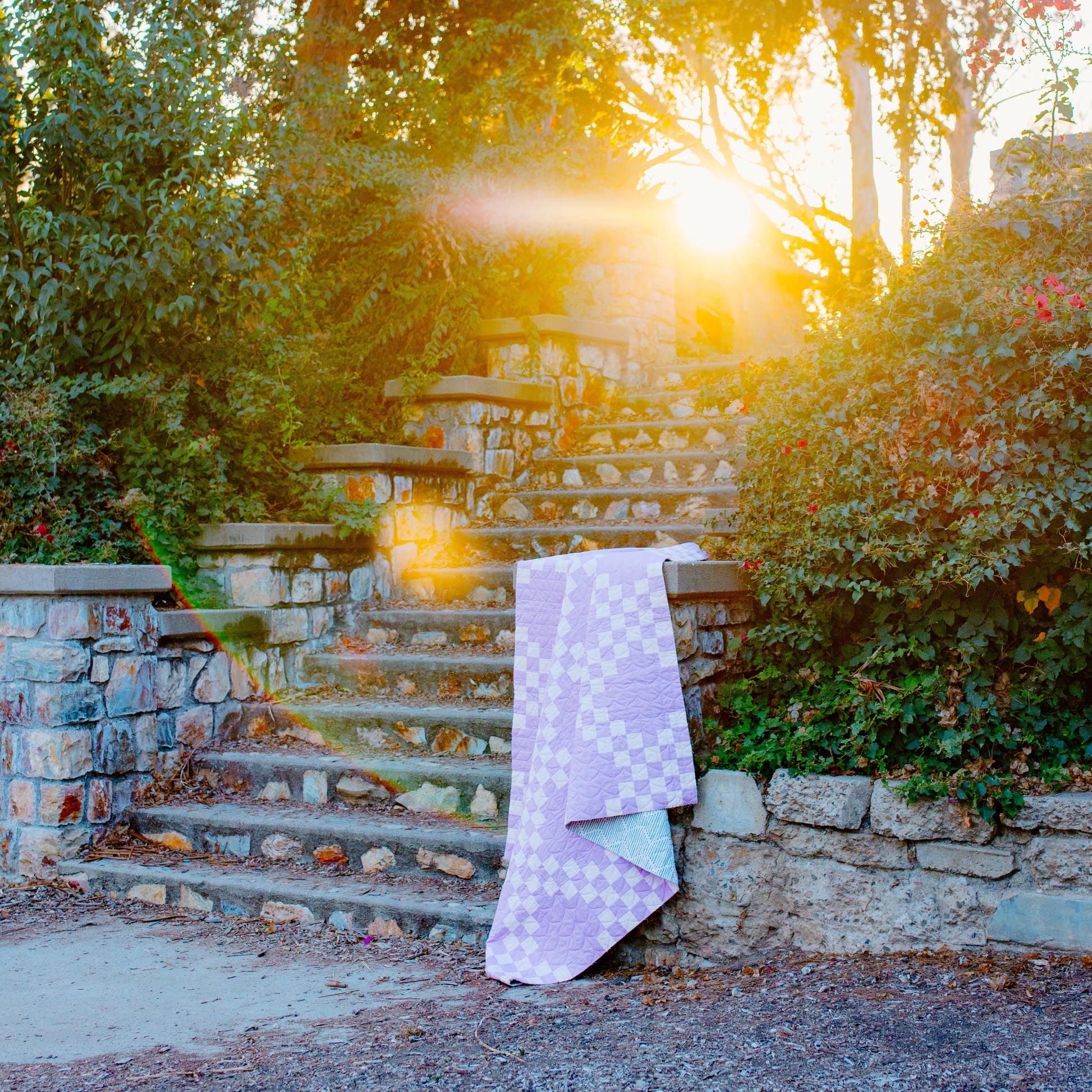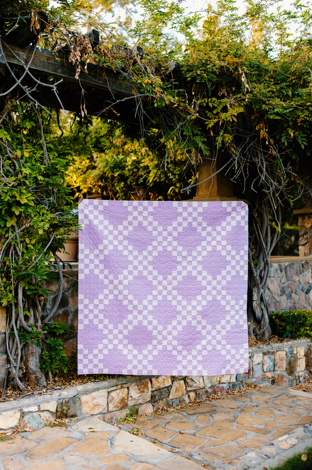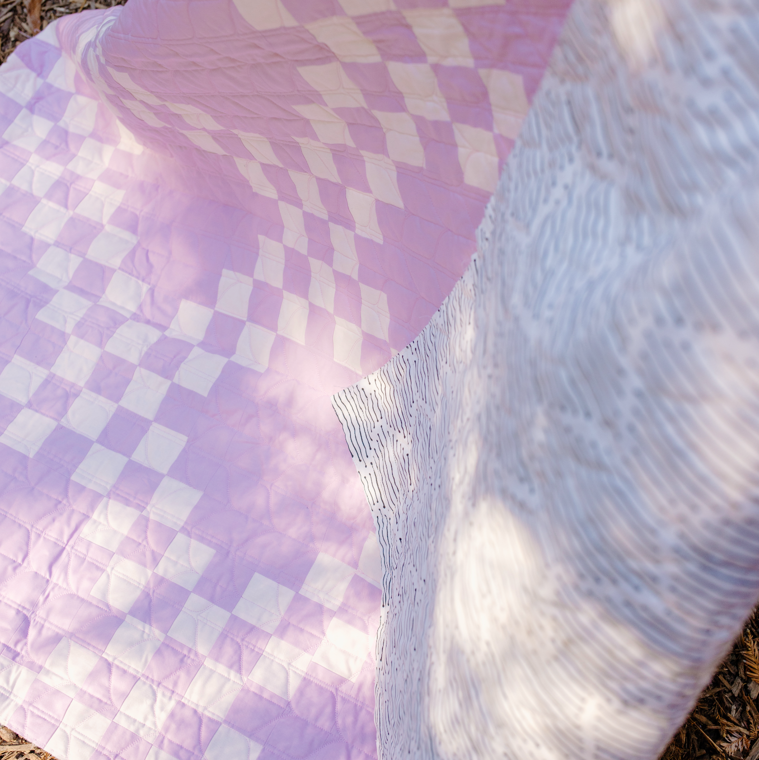 This beautiful 70” x 70” quilt is a modern take on the timeless Double Irish Chain design, made using the Heritage Series pattern by @penelopehandmade. Featuring soft, dreamy shades of Kona Cotton in Petunia and Ballet Slipper, it exudes an elegant and feminine charm. The backing fabric, Art Gallery Fabrics’ Mindful Paths, adds a serene, meditative touch to this heirloom-quality piece. This quilt will be bound with a light blue solid cotton fabric.