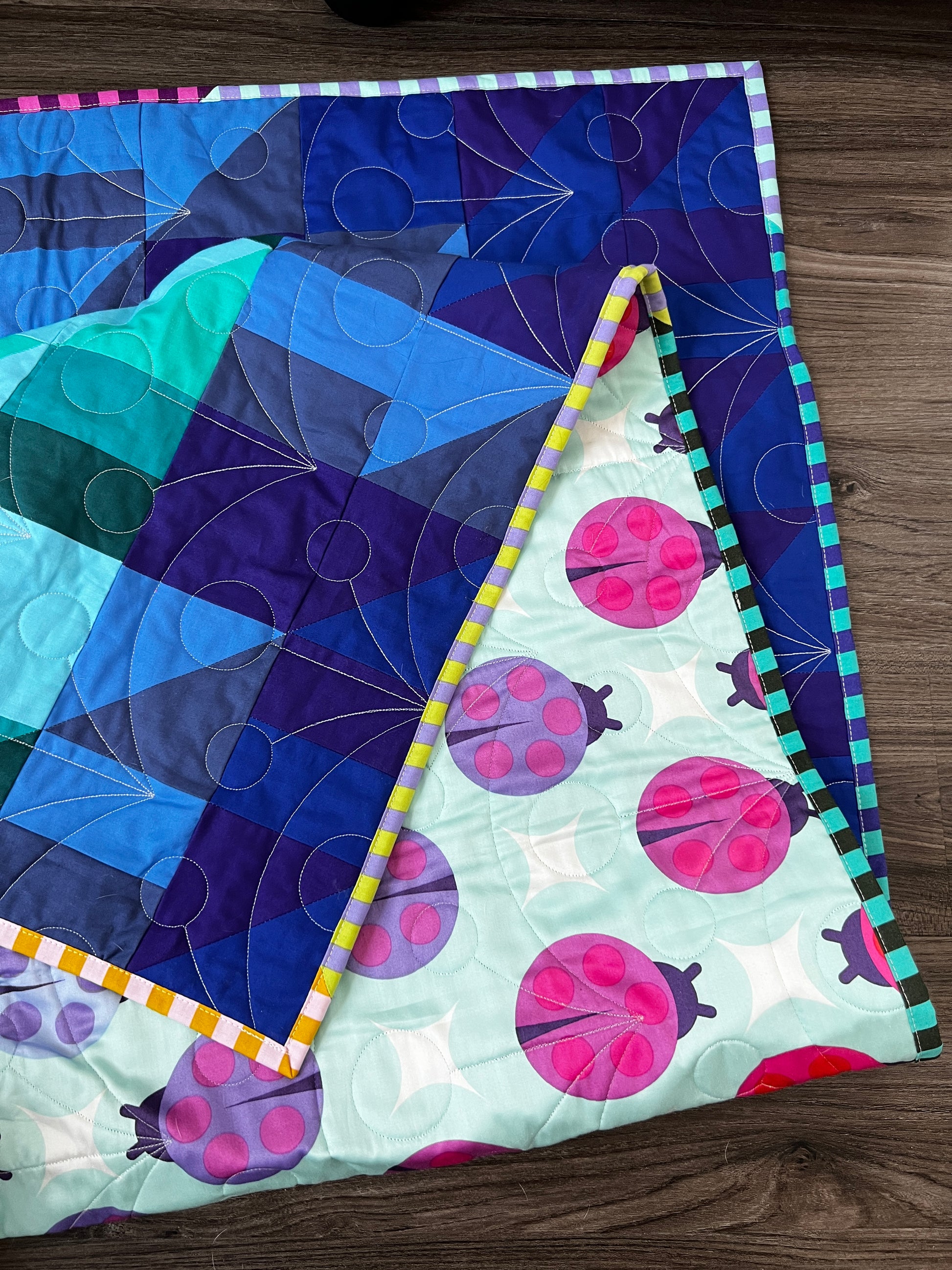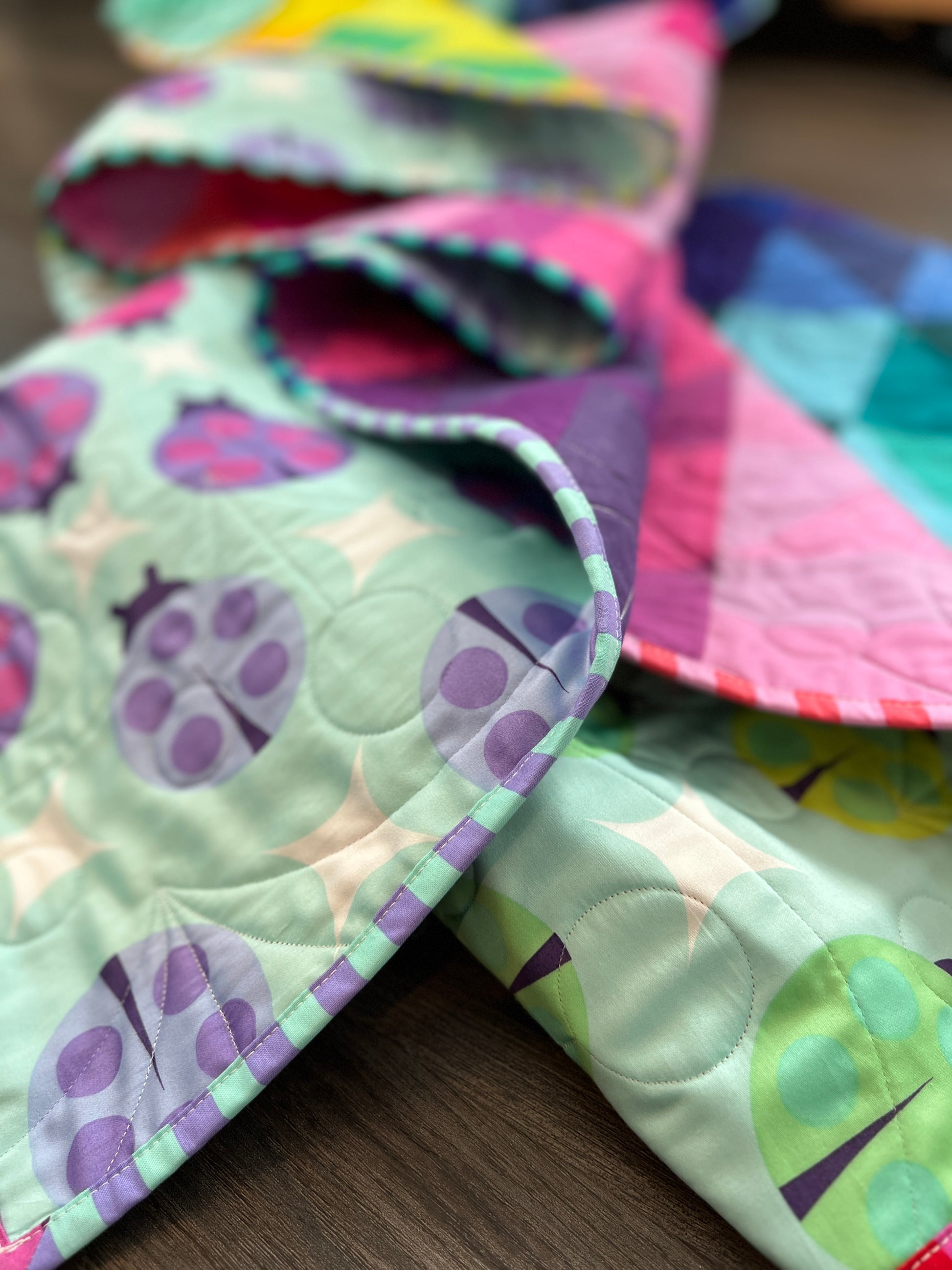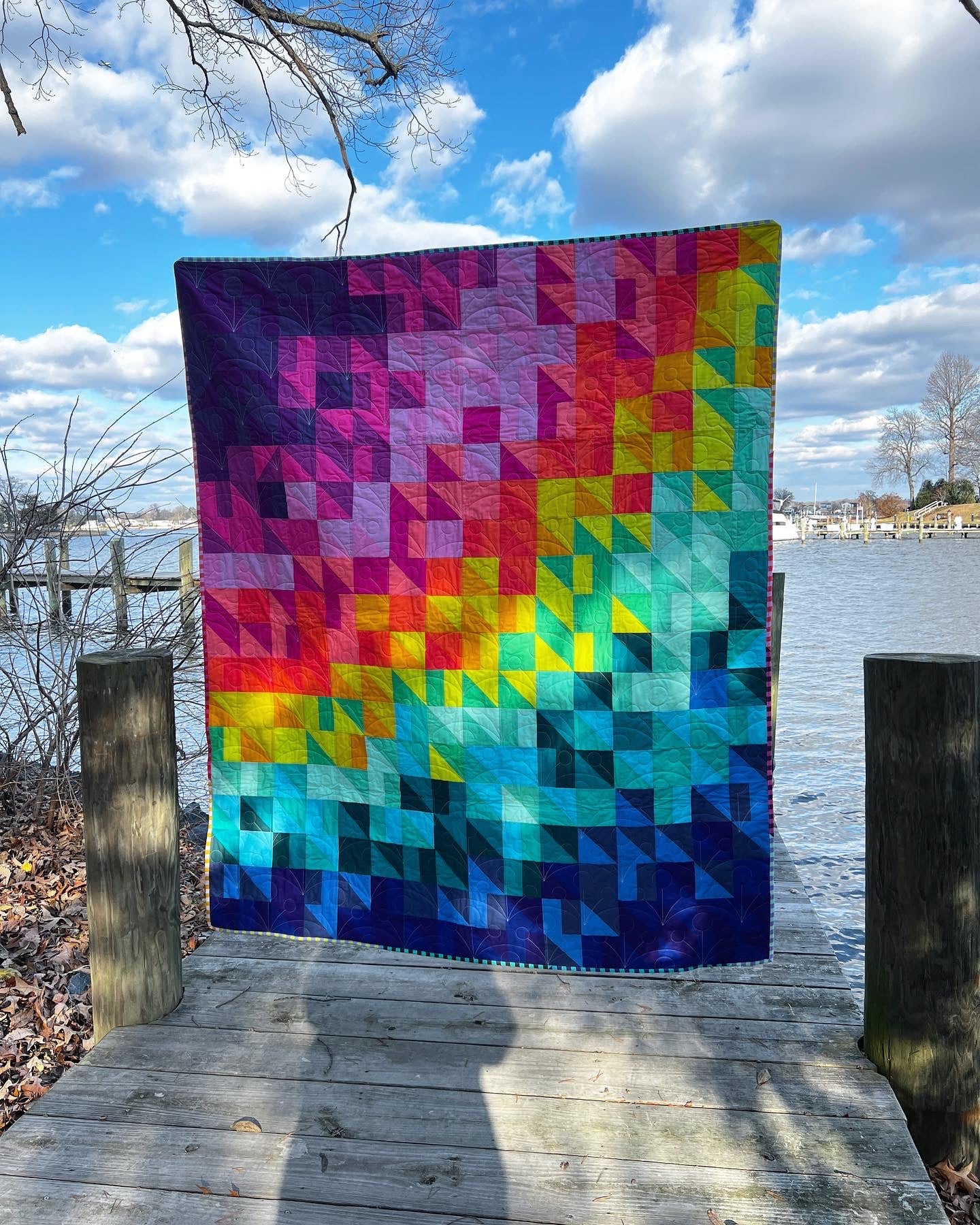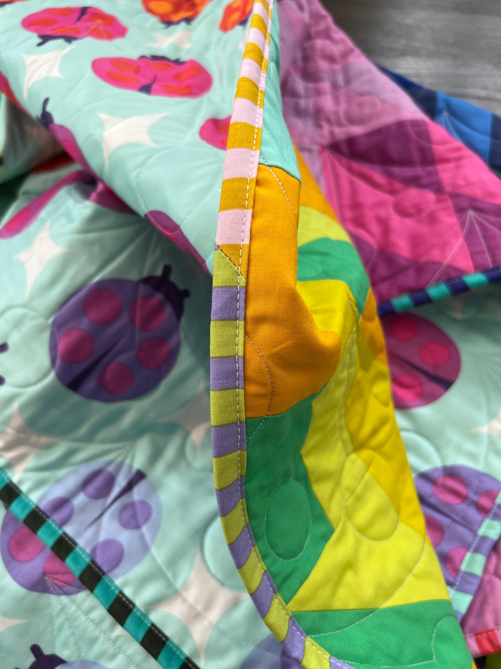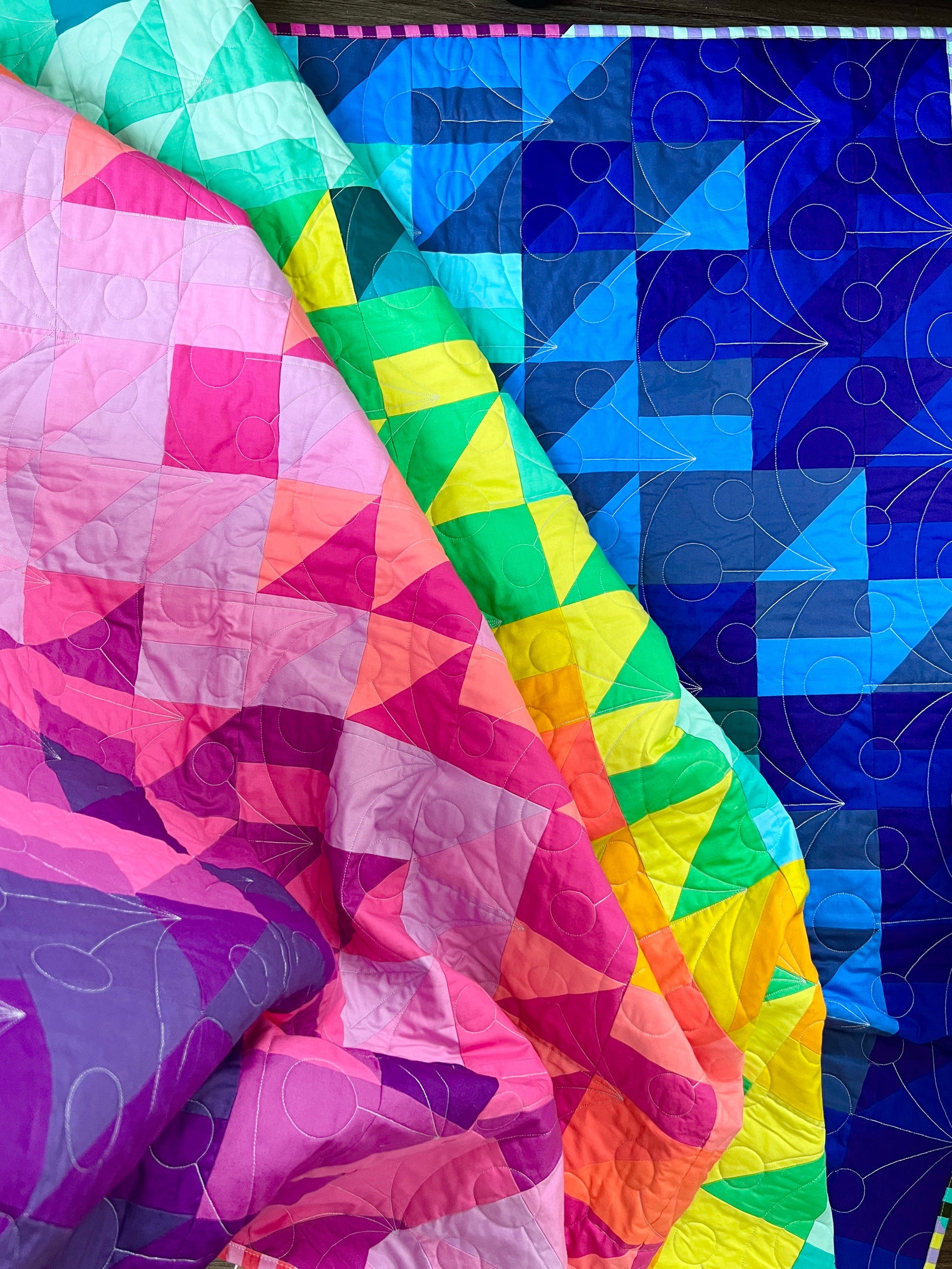 Quilted with the Wishing pantograph by @thequiltingmill and long-armed by the talented @quiltysaurus, this piece has beautifully flowing textures that enhance its rainbow-like design.