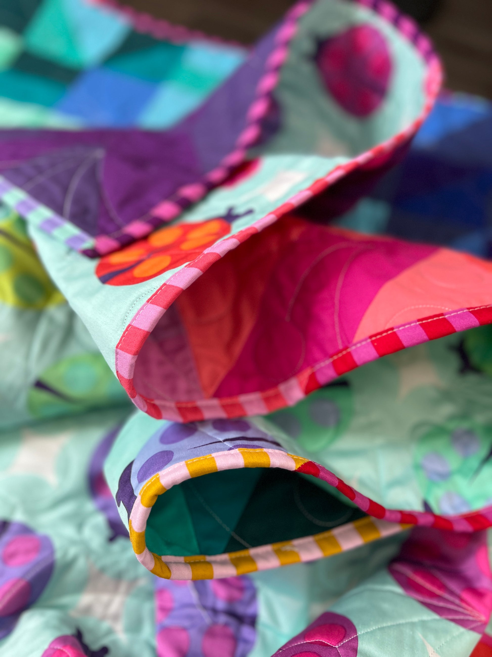 This stunning throw-size quilt (64" x 76") features the vibrant Caper Quilt pattern by Jittery Wings, brought to life with a striking Tula Pink fabric bundle from Crimson Tate. The colorful scrappy binding adds a whimsical touch, full of charm and personality.
